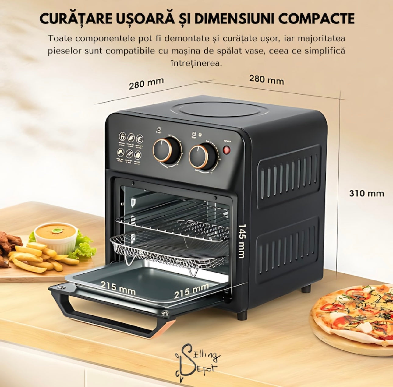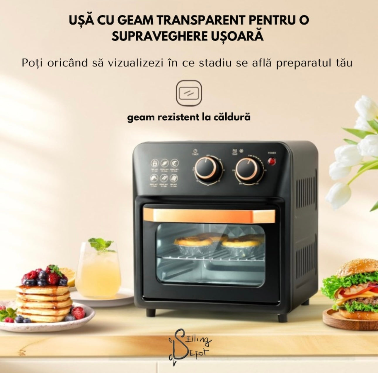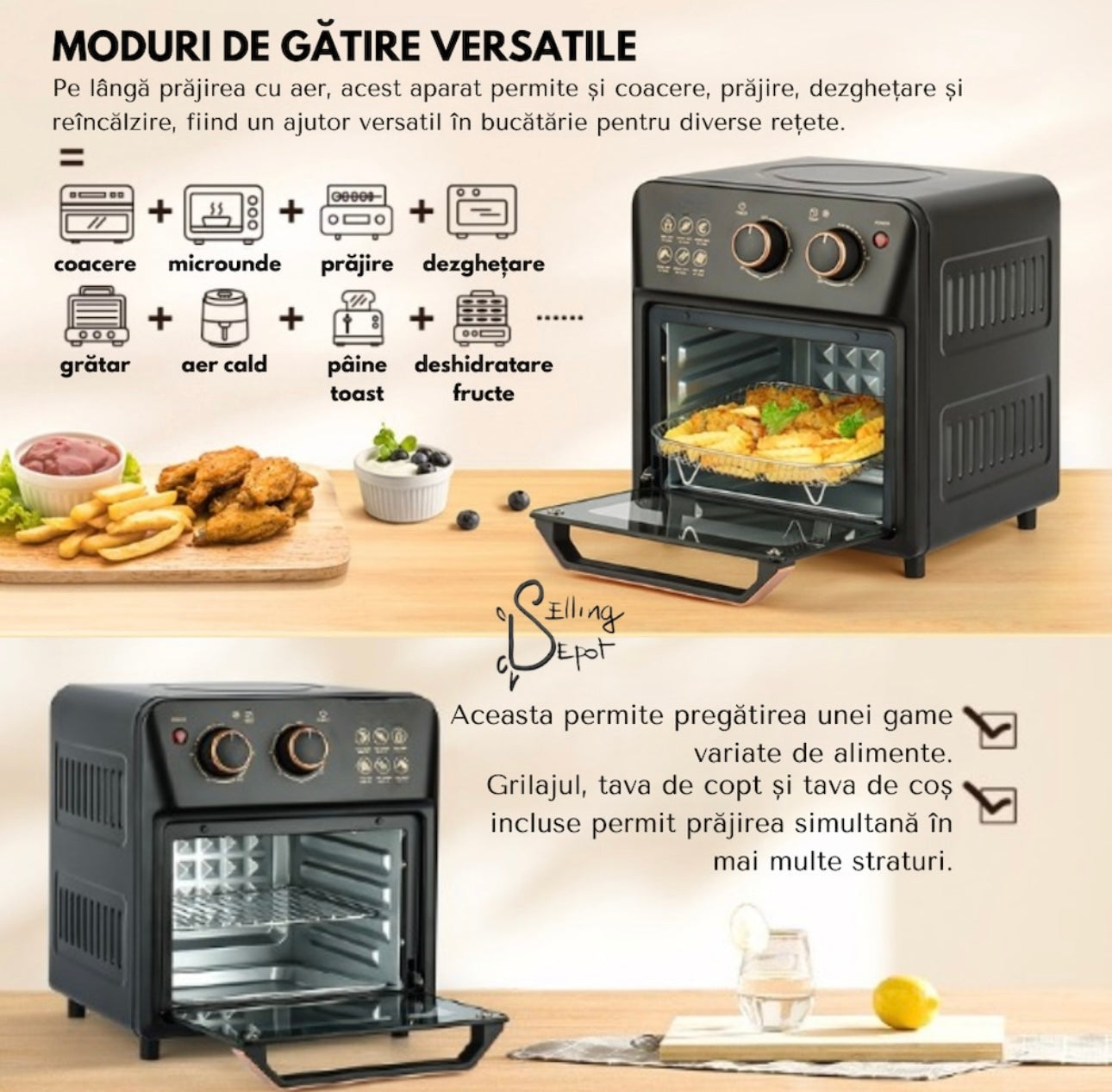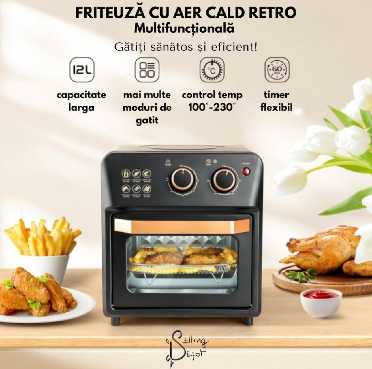 Friteuza cu aer cald retro de la Selling Depot® este un cuptor multifunctional de 12 litri, conceput pentru a oferi o experienta de gatit versatil si sanatoasa. Iata detalii despre functionalitatile si caracteristicile principale ale acestui produs: