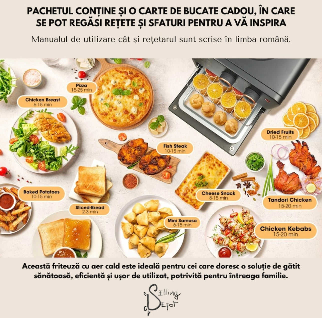 Aceasta friteuza cu aer cald este ideala pentru cei care doresc o solutie de gatit sanatoasa, eficienta si usor de utilizare, potrivita pentru intreaga familie.