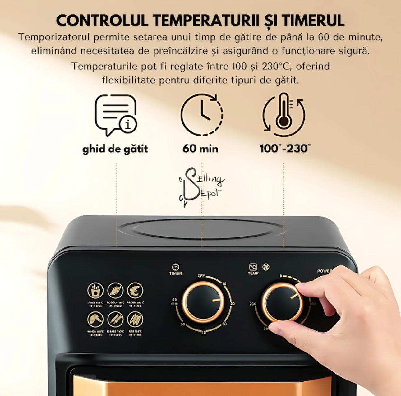 • Temporizatorul permite setarea unui timp de gatire de pana la 60 de minute , eliminand necesitatea de preincalzire si asigurand o functionare sigura.