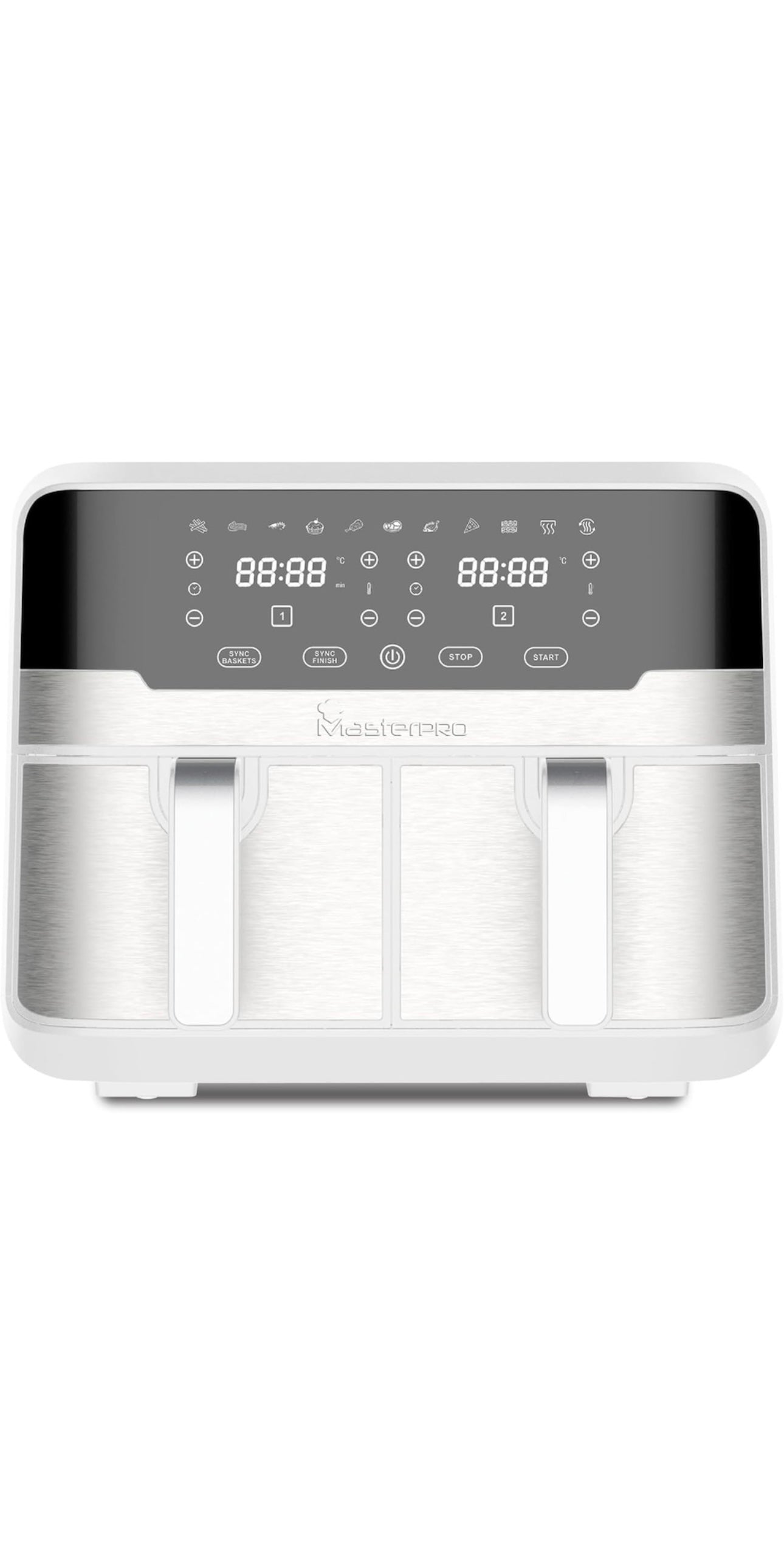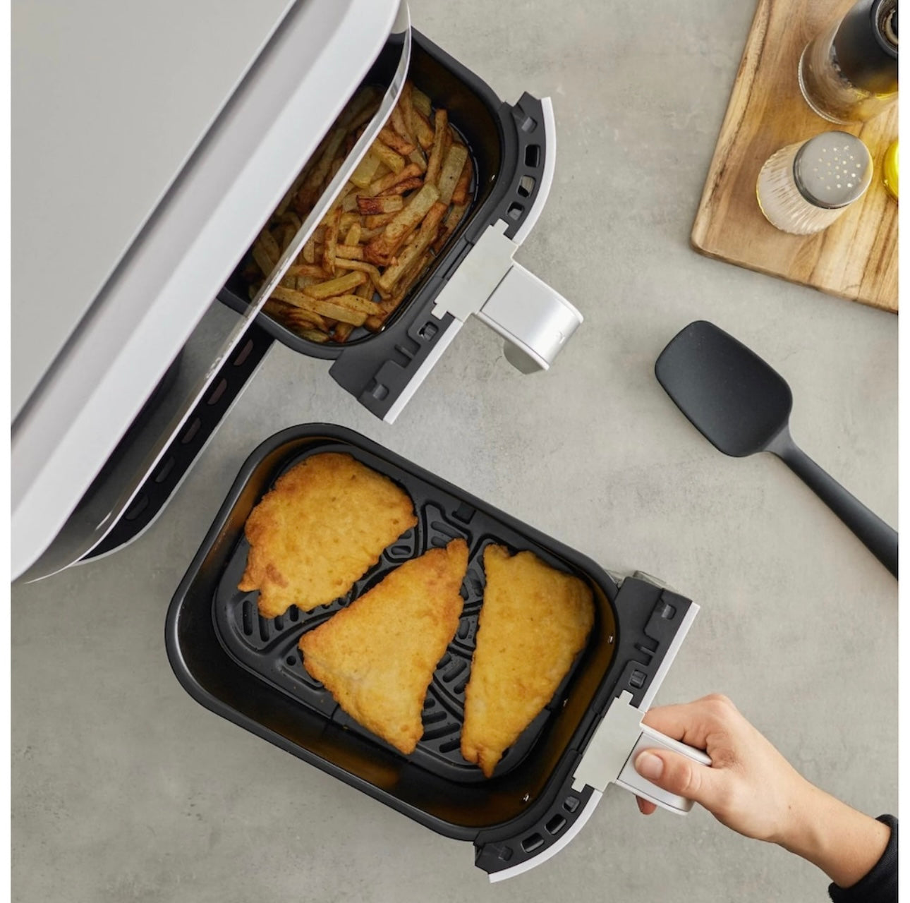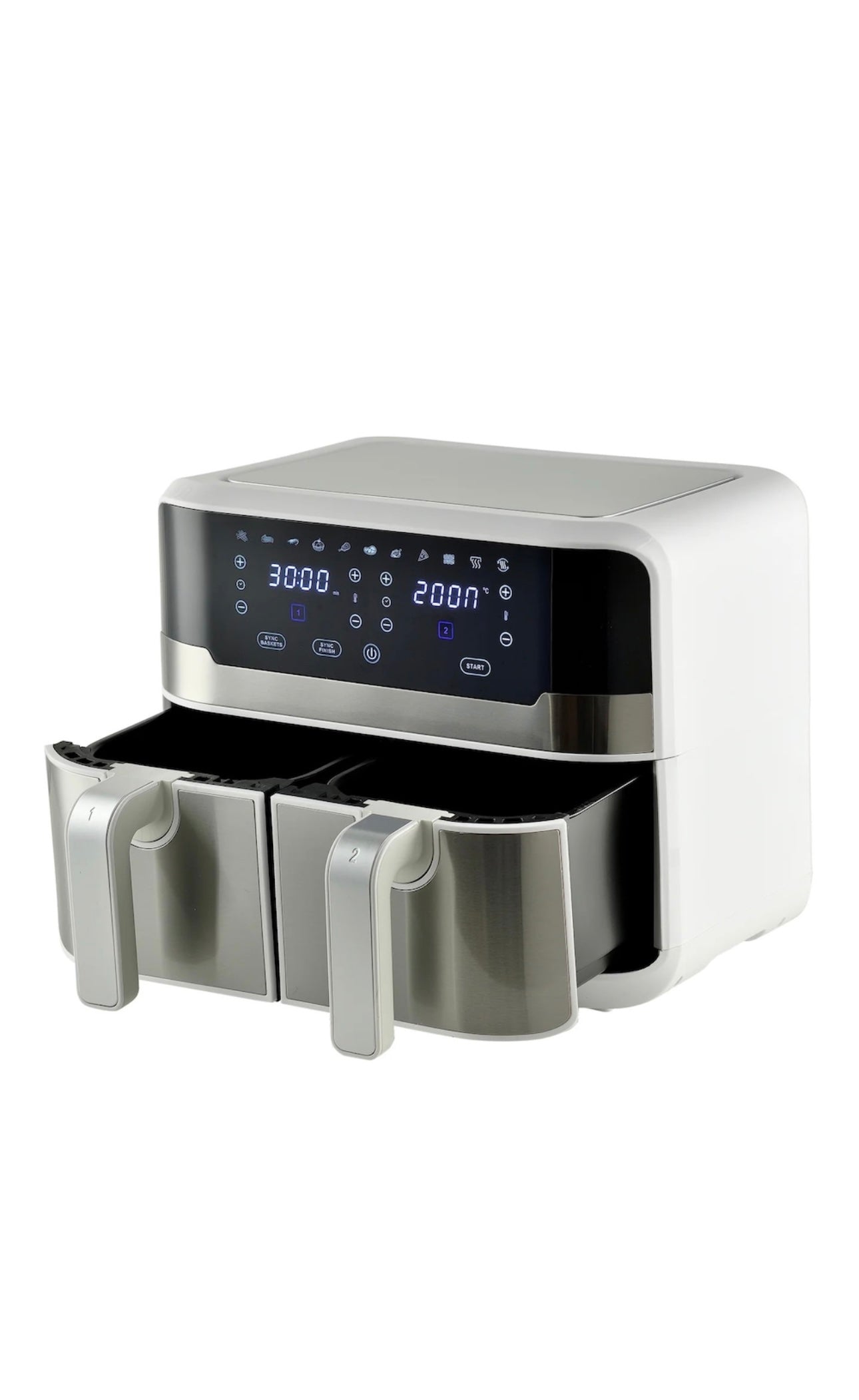Cu o capacitate de 9 litri, impartita in doua recipiente de 4,5 litri, o putere de 2100 wati si 11 programe diferite de gatit, aceasta friteuza cu aer cald va ofera o mare versatilitate atunci cand gatiti.