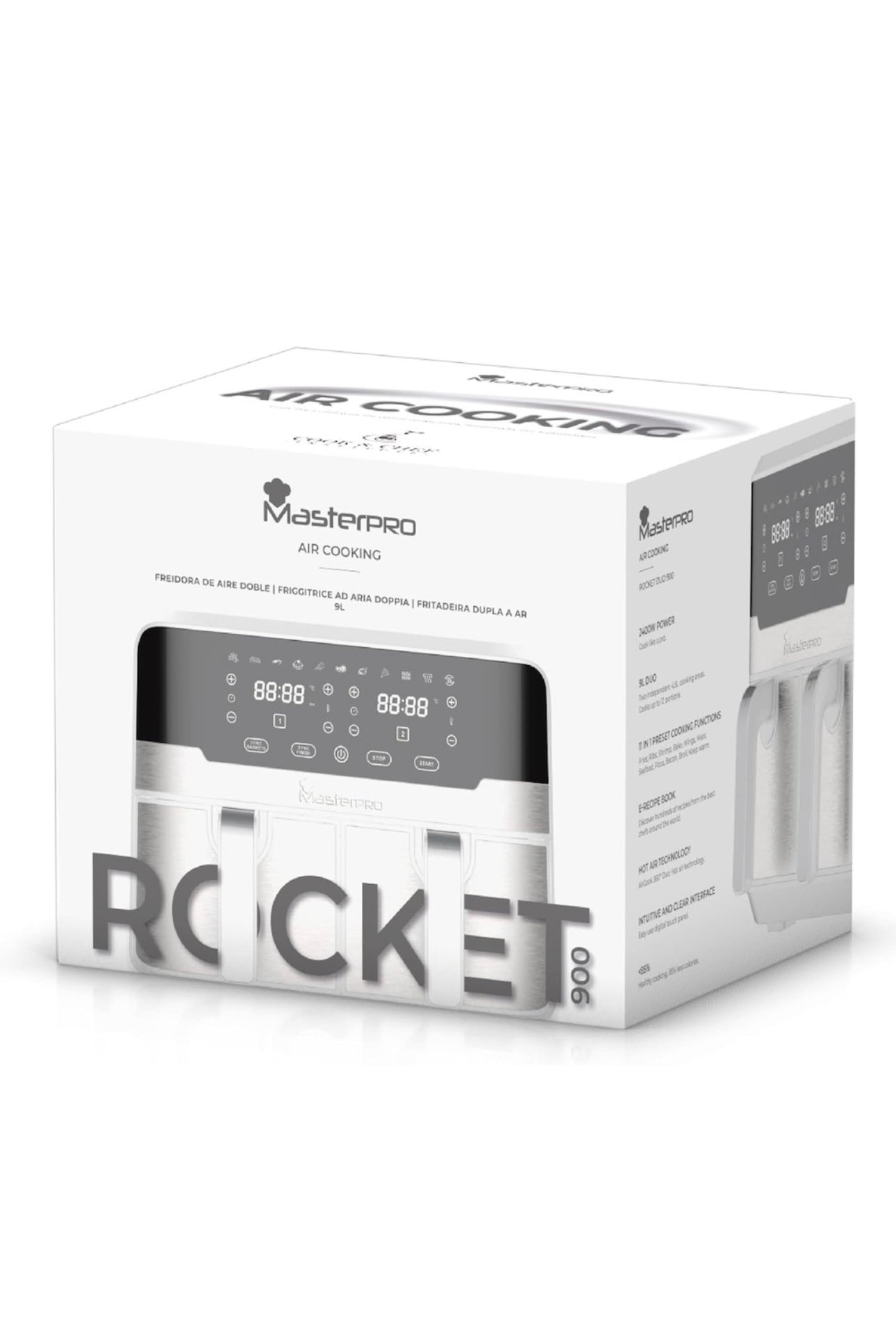 Descoperiti noua friteuza Rocket Duo, o combinatie unica de inovatie si sofisticare, realizata din otel inoxidabil si design alb elegant.