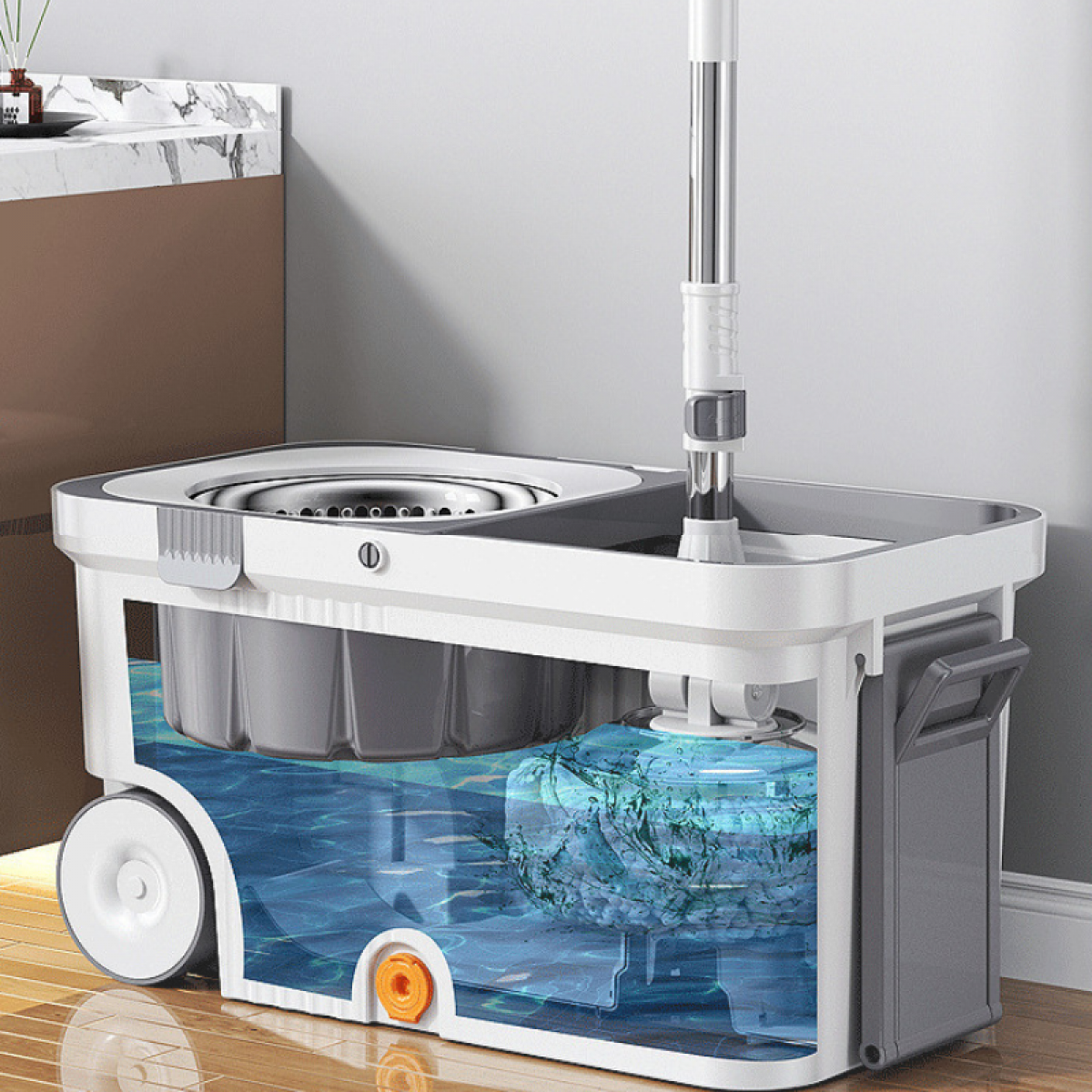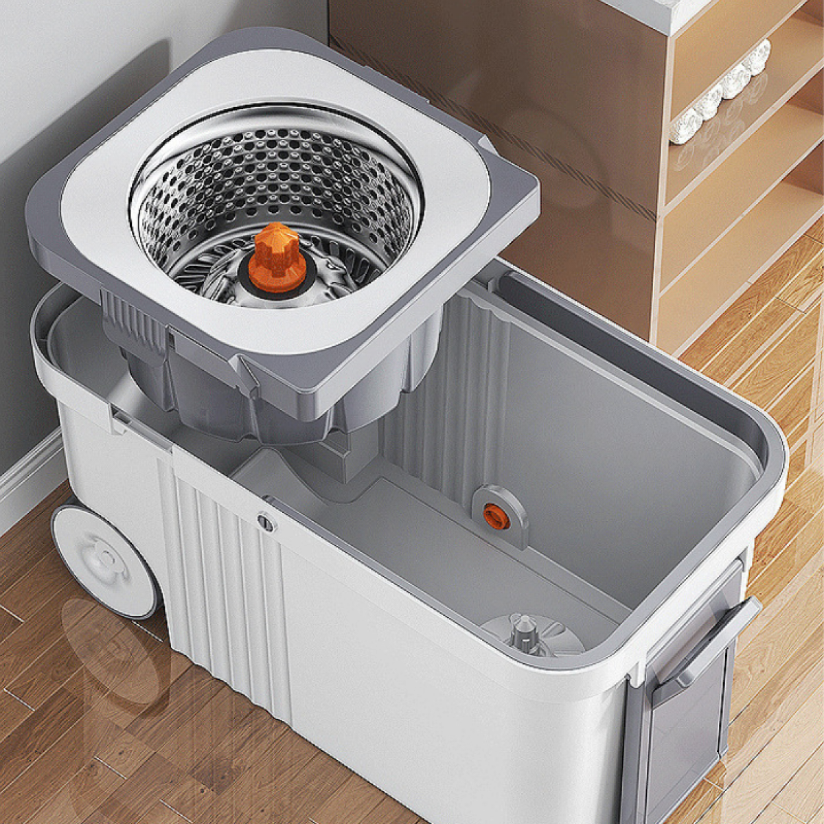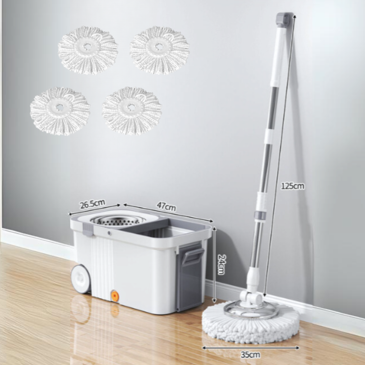 Set mop rotativ 360° cu galeata centrifuga din inox, 4 rezerve mop, galeata portabila, sistem evacuare apa, alb cu gri